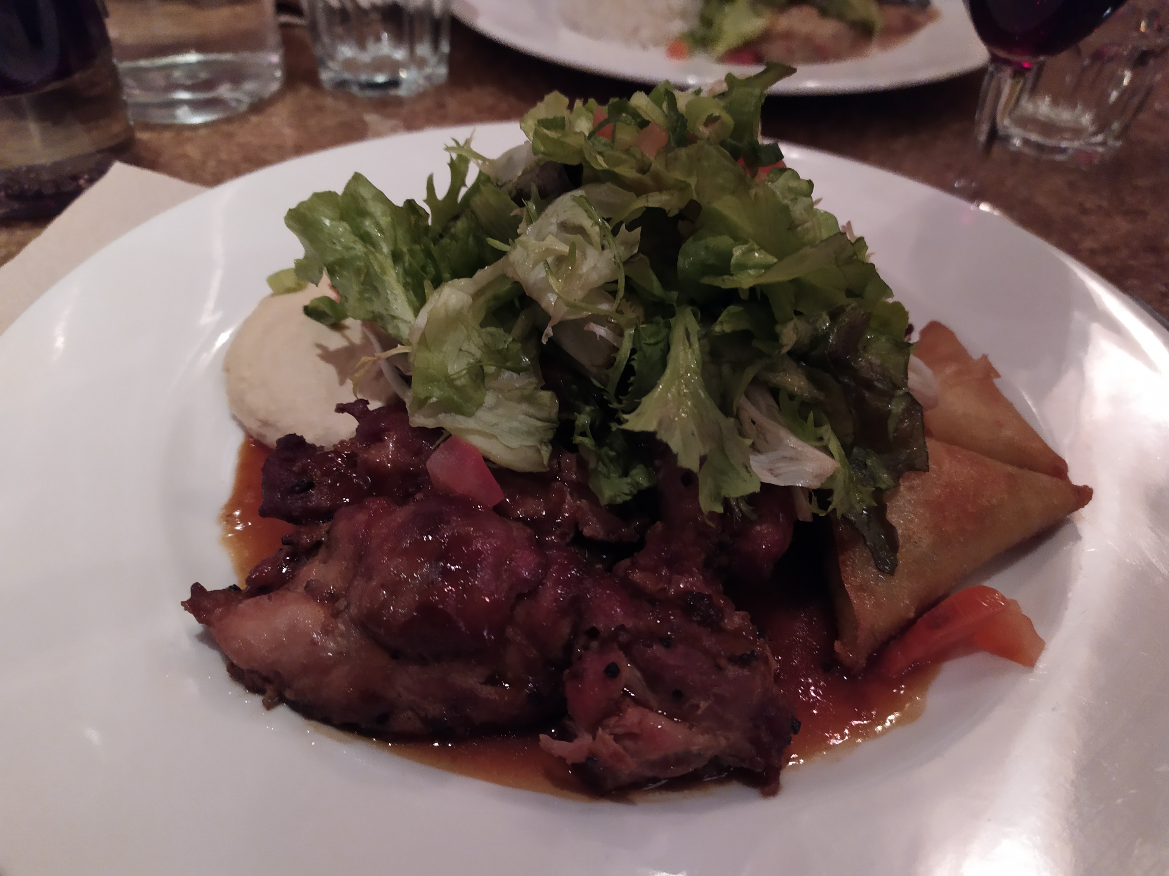 Cadre sympathique, le restaurant est très grand et dispose de différents salons qui permettent d'être à l'écart. Même lorsqu'il est rempli, l'on parvient toujours à s'entendre. Cocktail à prix raisonnable. Concernant les entrées, les samossas végétariens étaient très bons. Néanmoins, la boulette poulet thai était assez dure sous la dent. Le colombo de poulet était correct, bien que manquant de sauce. Néanmoins il n'y avait pas énormément de viande. L'accompagnement banane plantain surprend un peu, il serait appréciable de laisser le choix d'opter pour des pommes de terre voire des patates douces à la place des bananes.