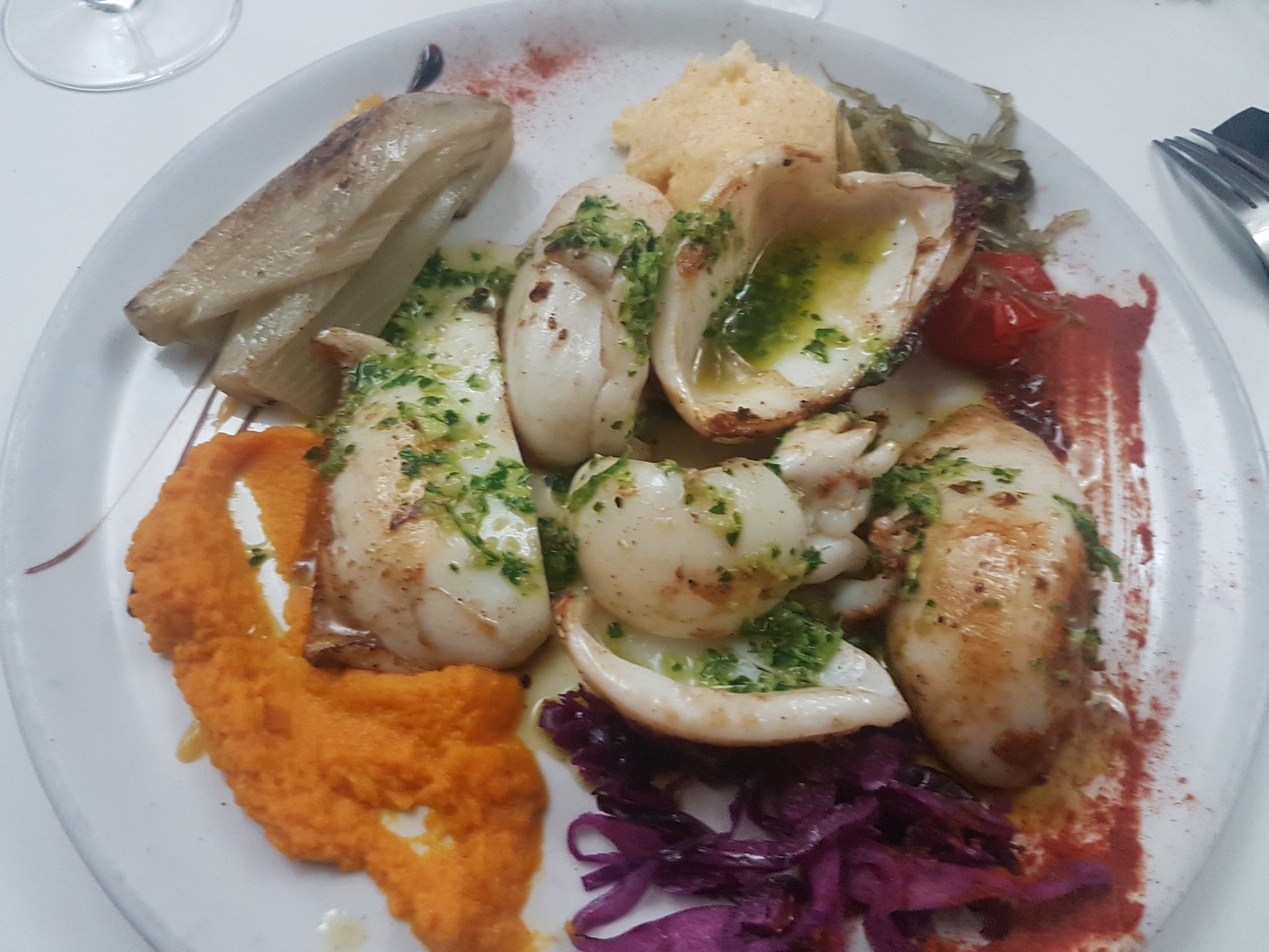 Lieu sympathique par contre pour les entrées les couteaux étaient mal nettoyés, les chipirons très gras et trop cuits. Les plats étaient mieux mais un peu trop cuits également. Attention de ne pas vous installer trop près de la cuisine pour l'odeur.