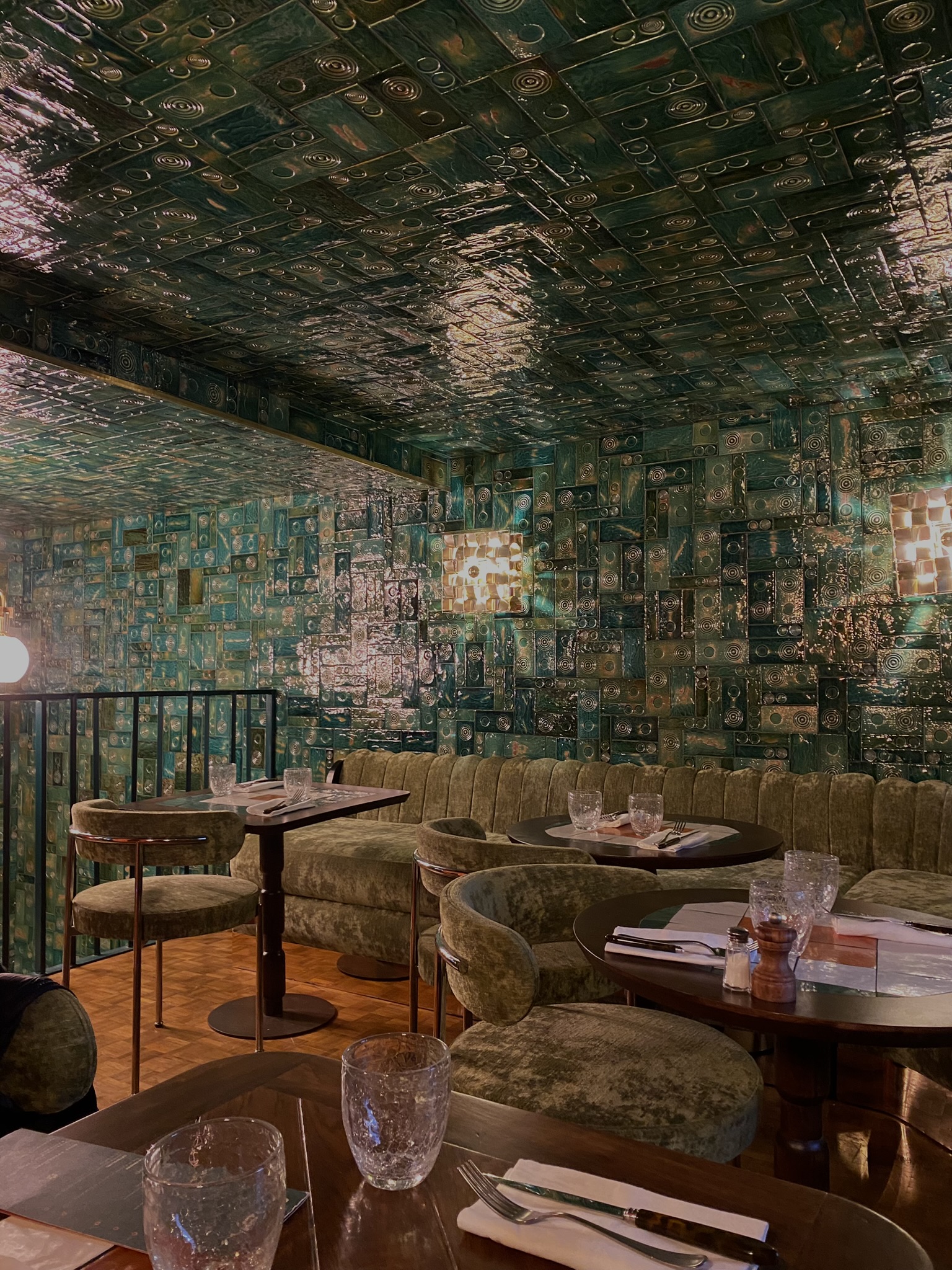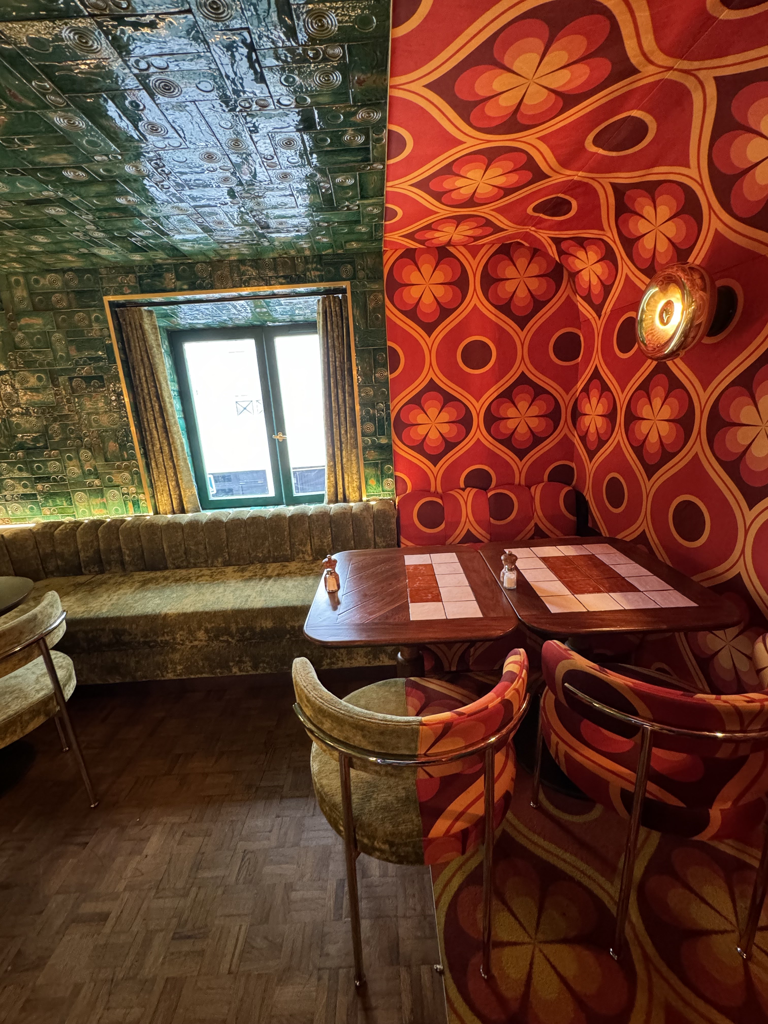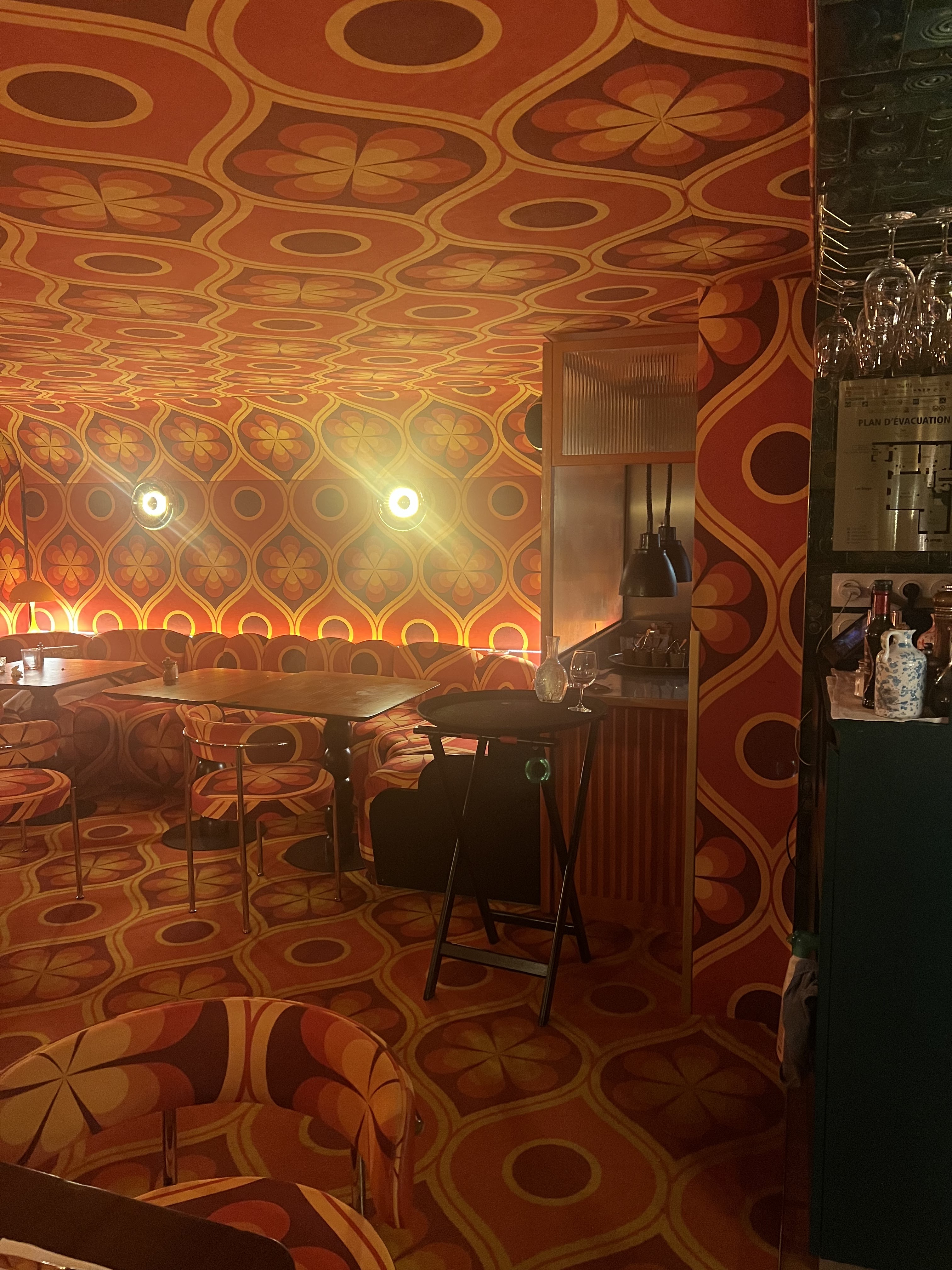 Lieu très sympa! La déco est vraiment cool, complètement tapissée de tissu des années 70 en haut c'est marrant. La nourriture est bonne, j'ai pris des pâtes à la truffe. Le service est OK, les serveurs sont très gentils et souriants. J'ai trouvé ça cher quand même, 35€ les pâtes à la truffe, il y a la quantité mais limite c'est un peu trop et on aimerait payer 5€ de moins. Les boissons sont chères aussi et les desserts 12€ donc globalement expérience et cadre sympa, bonne nourriture mais pas donné.