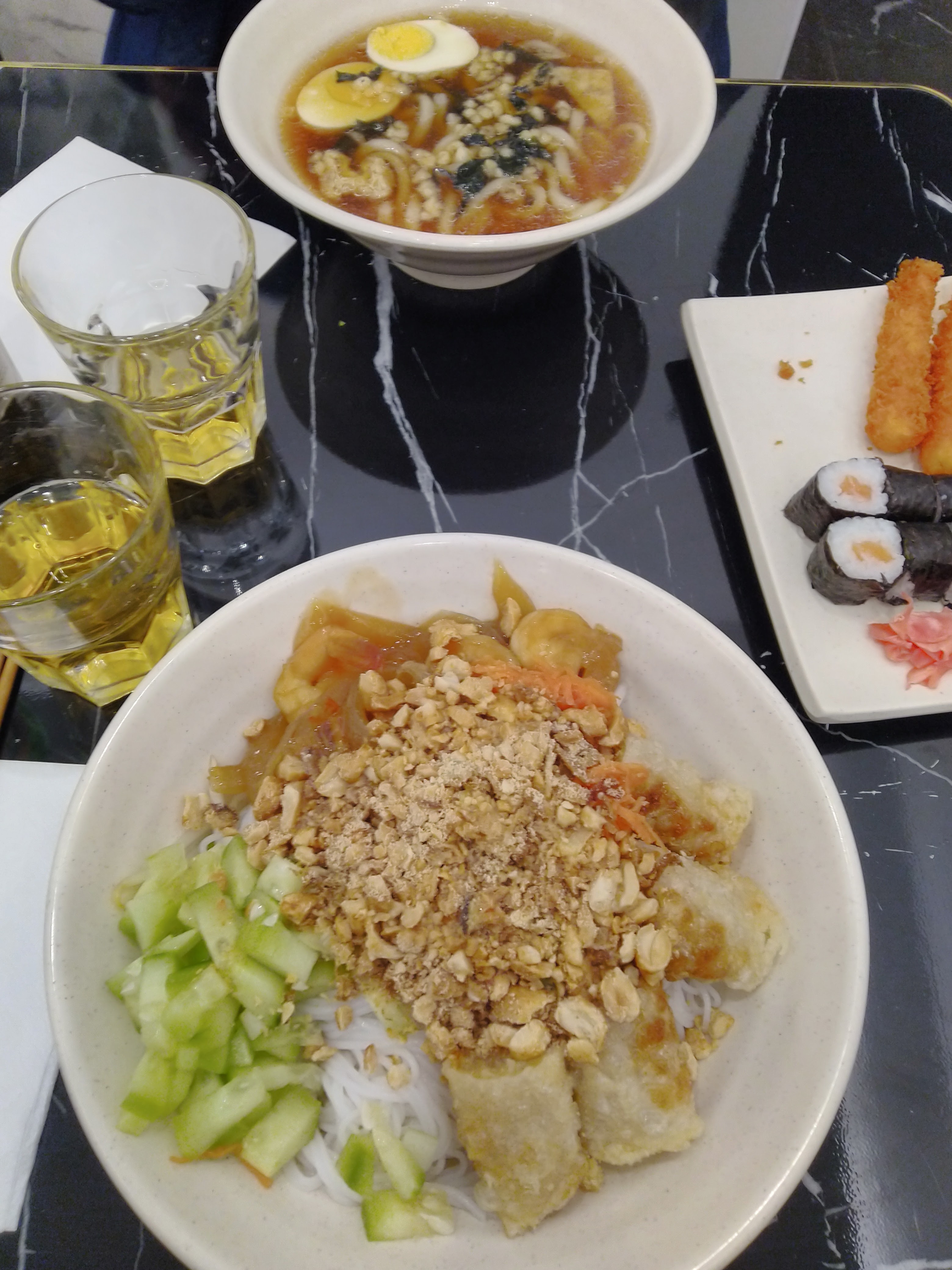 Personnel très sympa mais vraiment pas au niveau, le riz vinaigré était vraiment raté, très gluant et collant, beaucoup trop cuit et le saumon pas tendre et en très petites quantité, bref sushi amateur. Pareil pour le bobun, nouilles de riz trop cuite et pleine d’eau de cuisson (cest vraiment pas bon), nem super industrielles, les moins chères possibles… Le bubble tea était bon mais c’est tout..