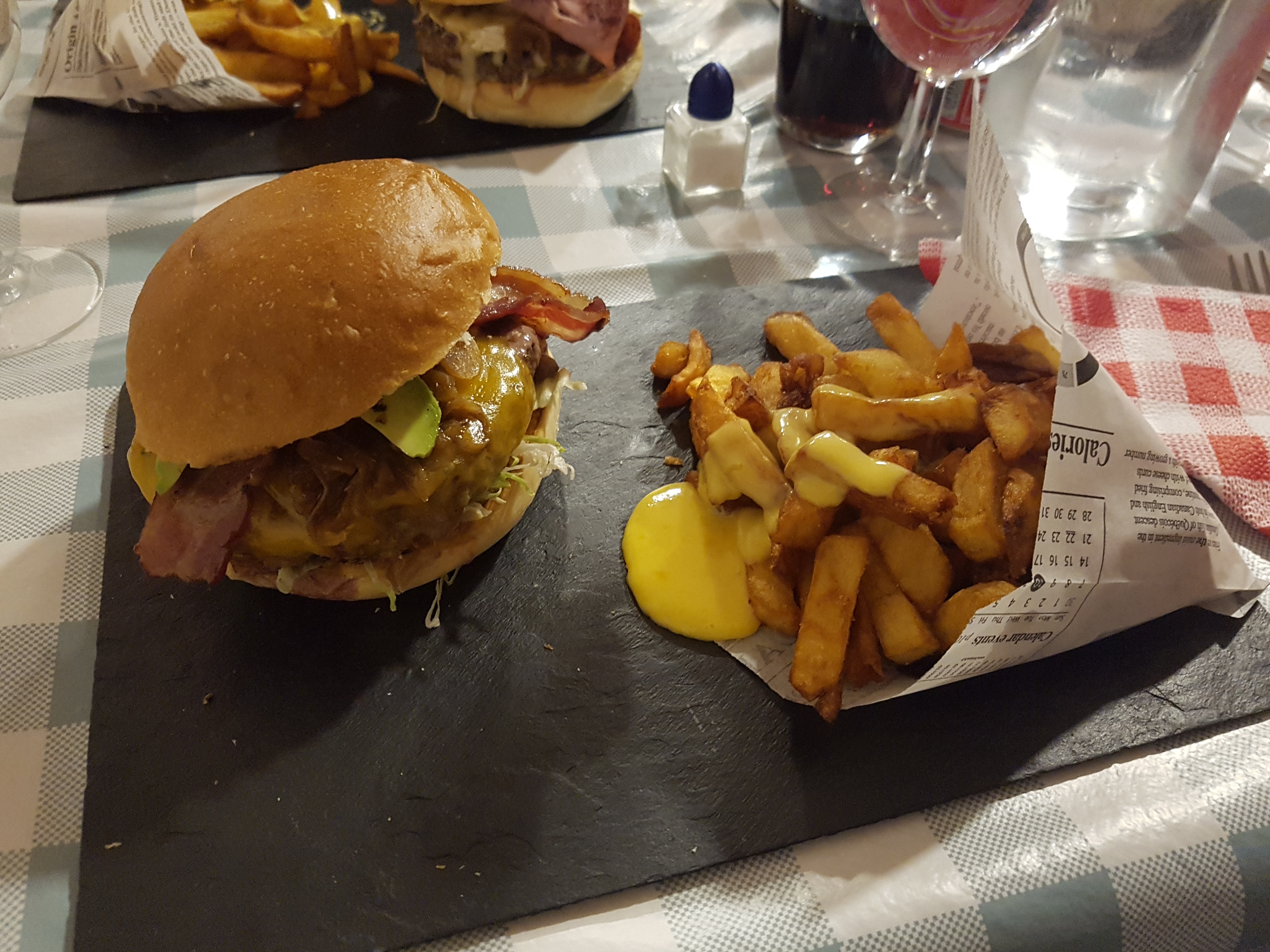 Super Burgers, à 10€ ou 12€ (dépendant du burger) avec frites maison et boisson, le tout servi sur ardoise donc très sympa. Les burgers sont très bien garnis, je recommande le french Can Can 😀