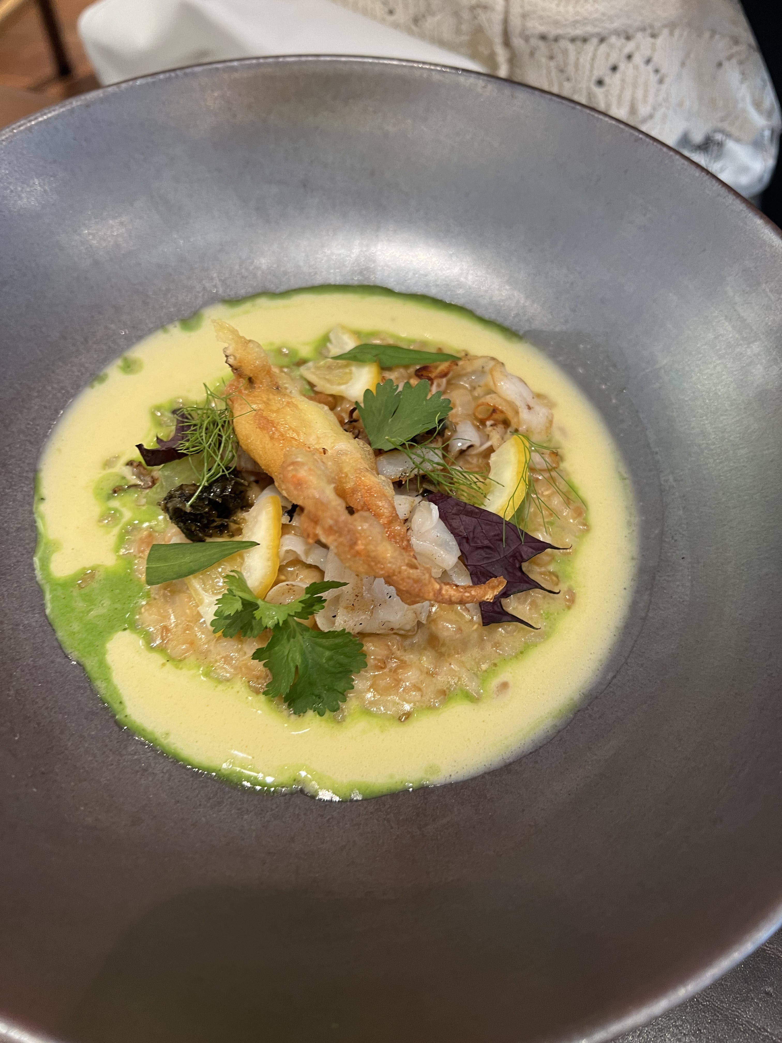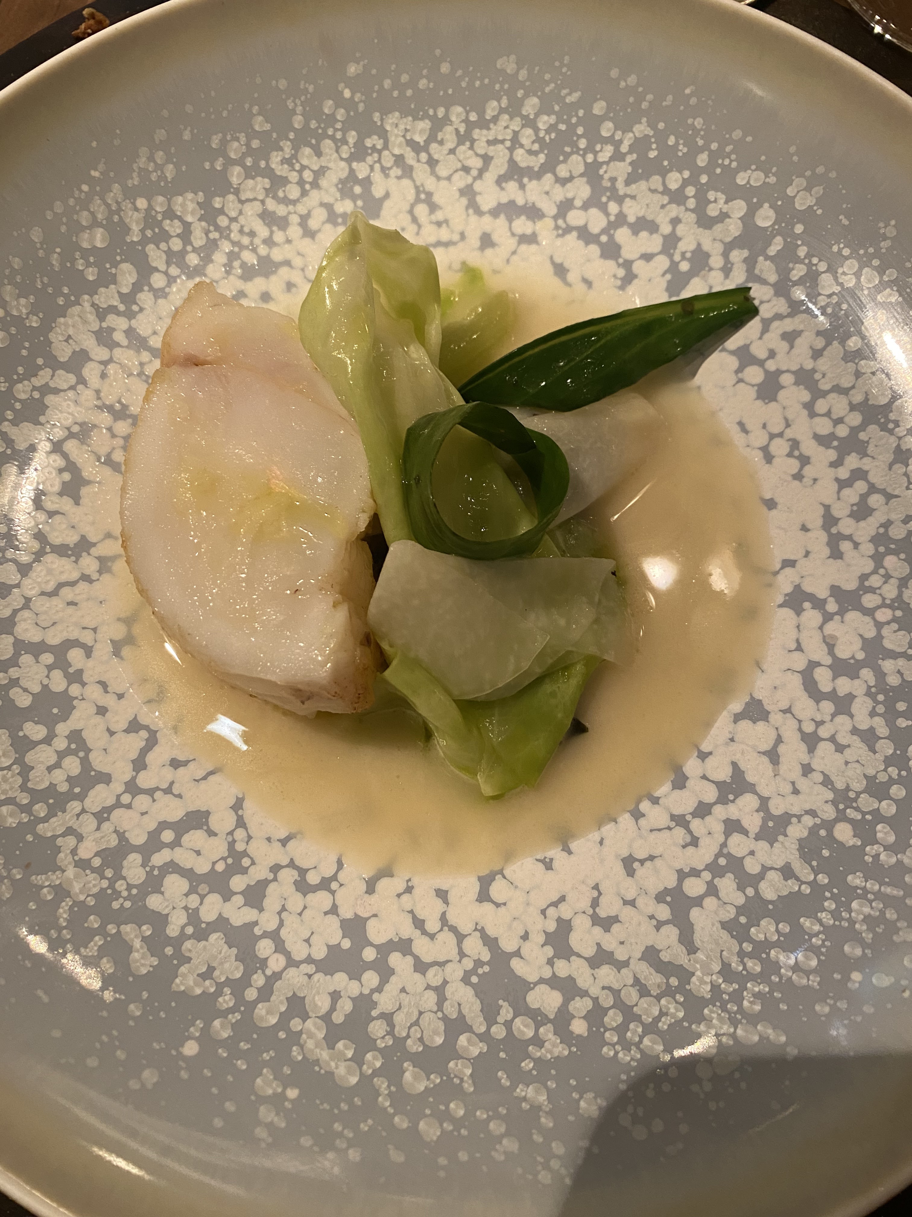 Excellent déjeuner. Nous avons eu le choix de l'entrée et du plat. L'ambiance est très agréable, les tables espacées et le niveau sonore très faible permettent de converser facilement. Le design et les œuvres d'art sont très agréables avec une cuisine ouverte qu'il est amusant de regarder et de s'émerveiller de la façon dont tant de personnel de cuisine s'intègrent dans ce petit espace. Les deux plats que nous avons eu étaient non seulement délicieux avec une superposition de textures et de saveurs, mais aussi merveilleusement composés dans le plat. Nous reviendrions certainement dans ce restaurant.