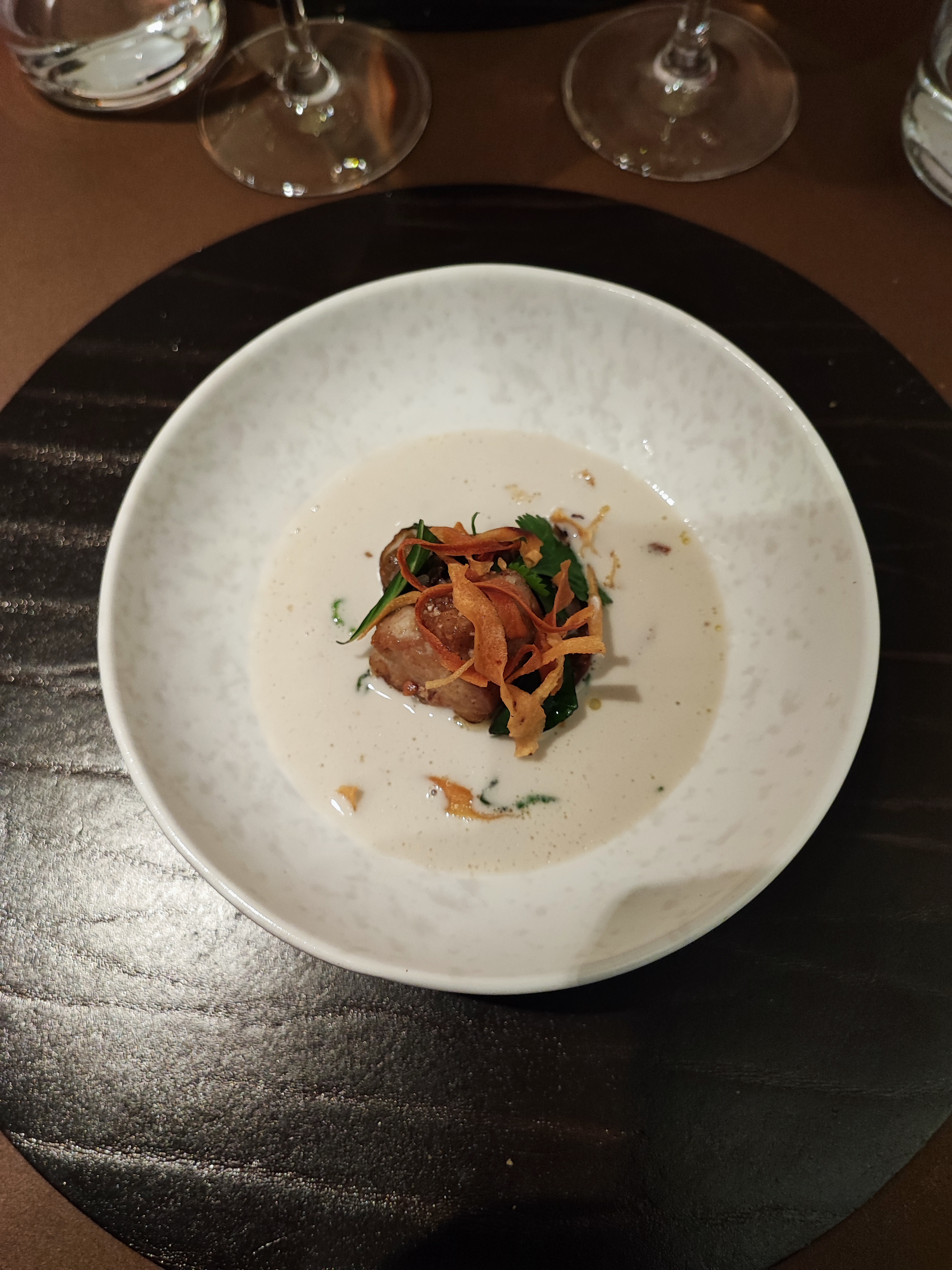 Lorsque vous visitez un restaurant étoilé Michelin, vous vous attendez à de la bonne nourriture avec un bon service. Cela n'a donc aucun sens d'en parler, car ce restaurant répond à toutes les attentes. J'ai aimé la cousine moderne et j'ai vraiment apprécié la touche asiatique de tous les plats qui servaient de scénario à travers tous les cours que nous avions. Si vous aimez regarder une équipe bien organisée en cuisine, vous êtes au bon endroit car de grandes fenêtres vous permettront de voir chaque préparation de chaque plat. Dans la critique, je ne peux partager qu'une seule photo - car j'ai toujours réalisé que je n'avais pas pris de photos seulement après avoir terminé la dernière bouchée. Il y a une chose à valoriser : je suis habituée aux accords mets et vins avec menu dégustation. La sélection de vins est large et couvre toutes les gammes de prix, cependant, les accords mets et vins permettront de déguster plus facilement des vins plus intéressants et d'accompagner des plats aussi merveilleux.