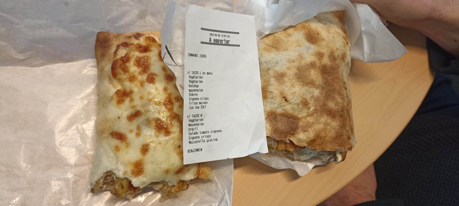 Commandé par téléphone à emporter, attente un peu longue de 25min pour 2 tacos (dont 1 menu). Il manque clairement du personnel car il n'y avait qu'une seule caissière pour gérer l'encaissement, l'emballage, le retrait des commandes des livreurs (parfois dans la rue). J'ai pris un tacos M simple végétarien + salade tomate oignons + mozzarella gratiné + oignons crispy sur gratin (7+1+1,5+0,5 = 10€). Il m'a été facturé 10€50, et j'ai expliqué par ce calcul à la caissière que c'était 10€, mais elle n'a rien voulu entendre car la machine ne se trompe pas. Je n'ai pas voulu insister. Avec mon collègue en ouvrant l'emballage, nous voyons qu'il n'y a pas d'oignons crispy à l'extérieur. Après réflexion, il y a du probablement avoir une confusion entre oignons crispy à l'intérieur et à l’extérieur (1€ au lieu de 0,5€), d'où la différence de 0,5€. Par contre pour ma part, je n'avais pas du tout d'oignons crispy. Par précaution, je vous déconseille les oignons crispy. Points positif : Tacos très bons avec les frites maisons. C'était la 2ème fois que je viens mais à cause de cette mauvaise expérience, j'hésite à revenir. [Ajout] 3ème et dernière fois que je viens. Service ok mais tacos très moyen pour le prix... J'ai pris un tacos avec viande végétale et salade tomate oignon à 8€