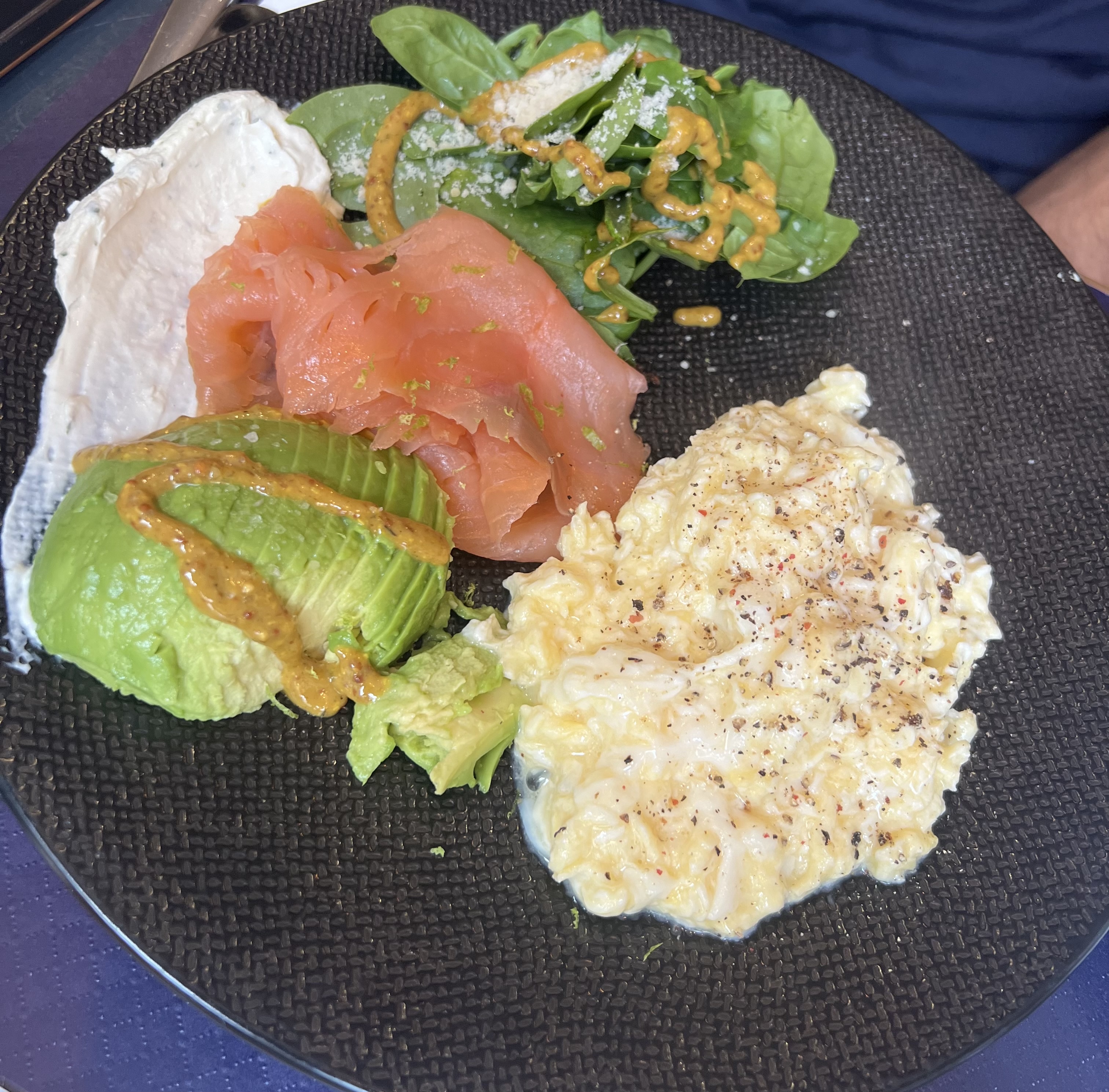 J'ai eu les œufs brouillés avec des légumes, du cappuccino et du pain perdu. Tout bon