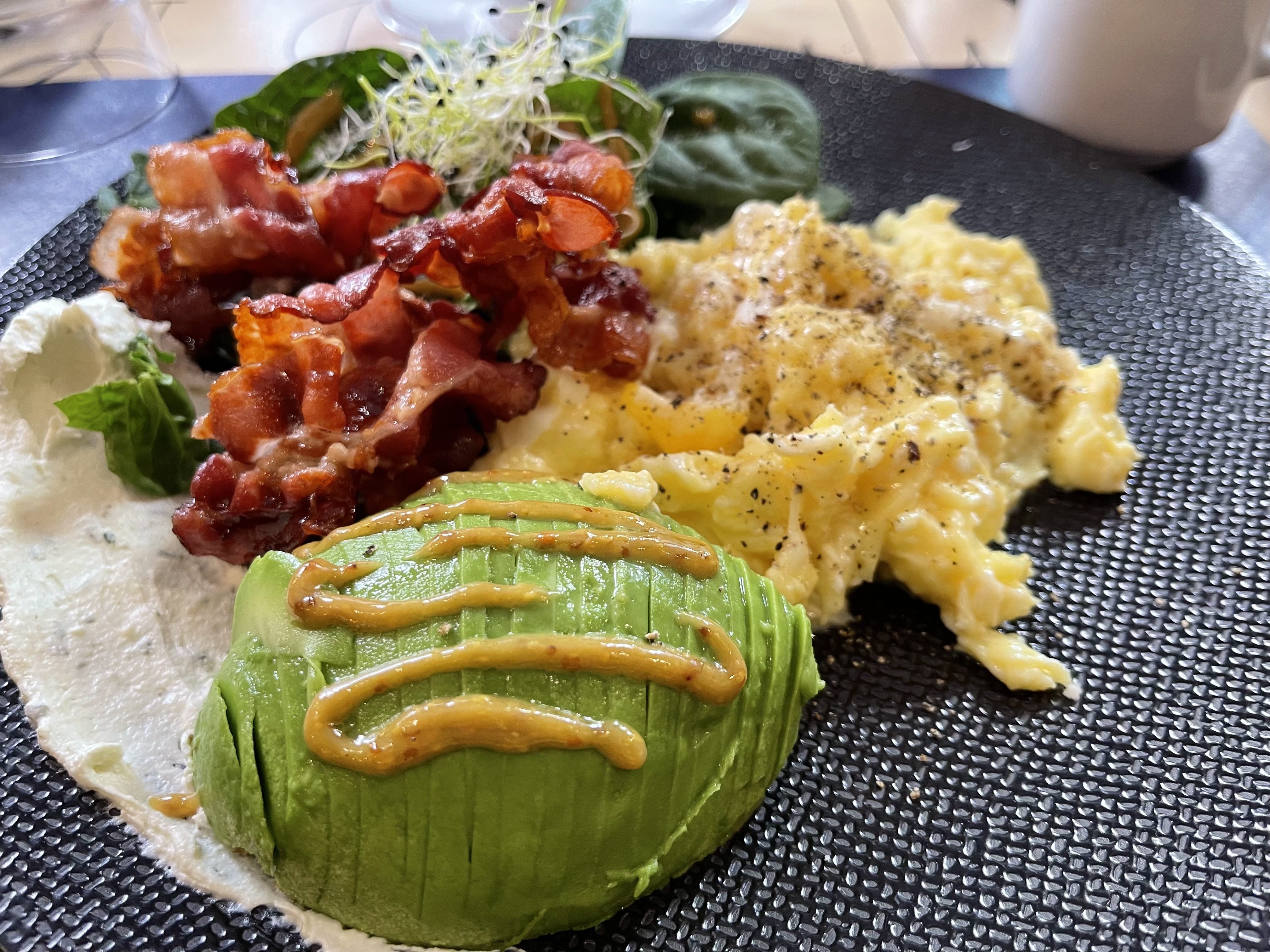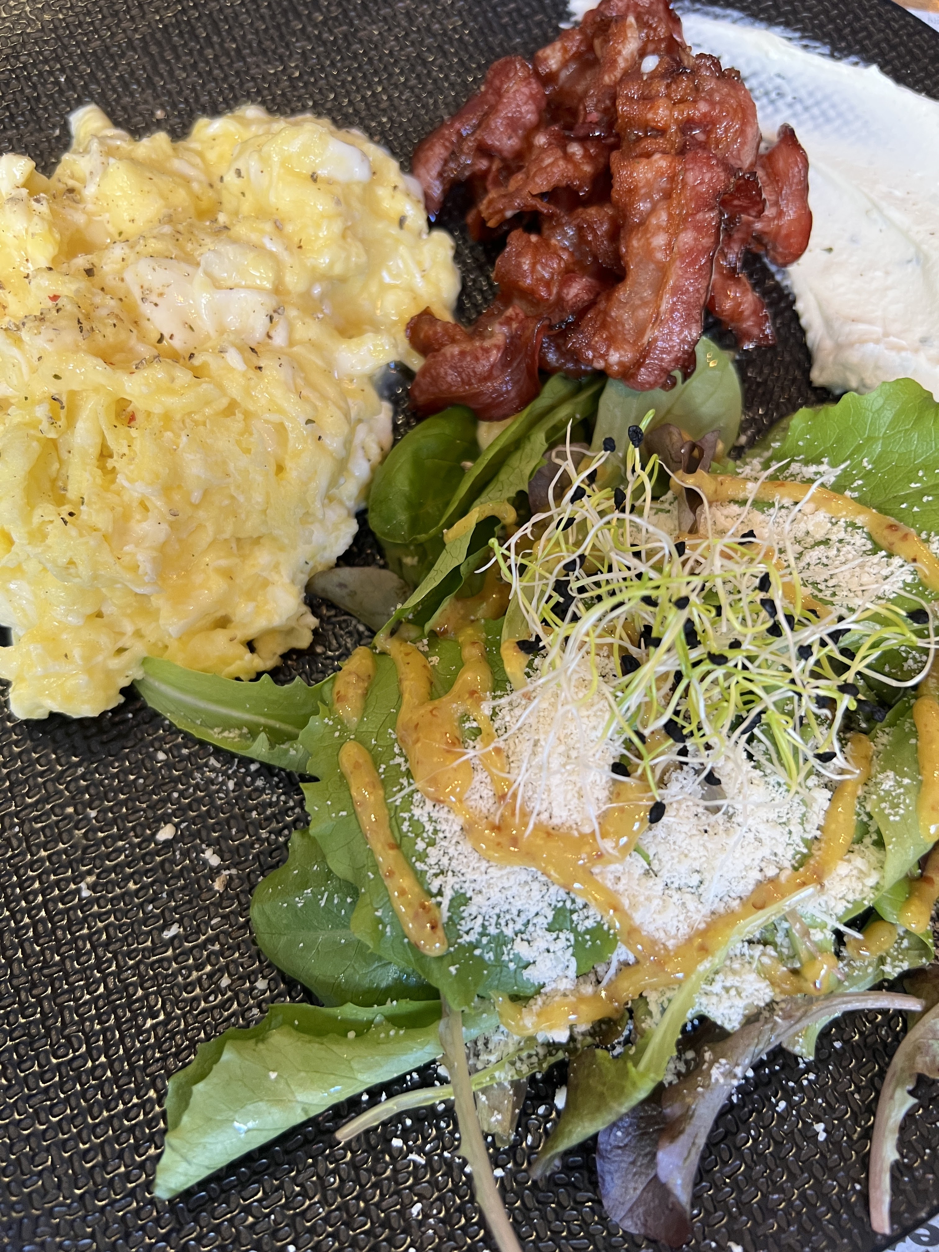 Super petit déjeuner ! Merci les gars 🙏 Bacon croustillant et délicieux et œufs brouillés. J'ai adoré la crème au fromage en accompagnement 😉 Jus de fruits frais et bon café Je recommande vivement