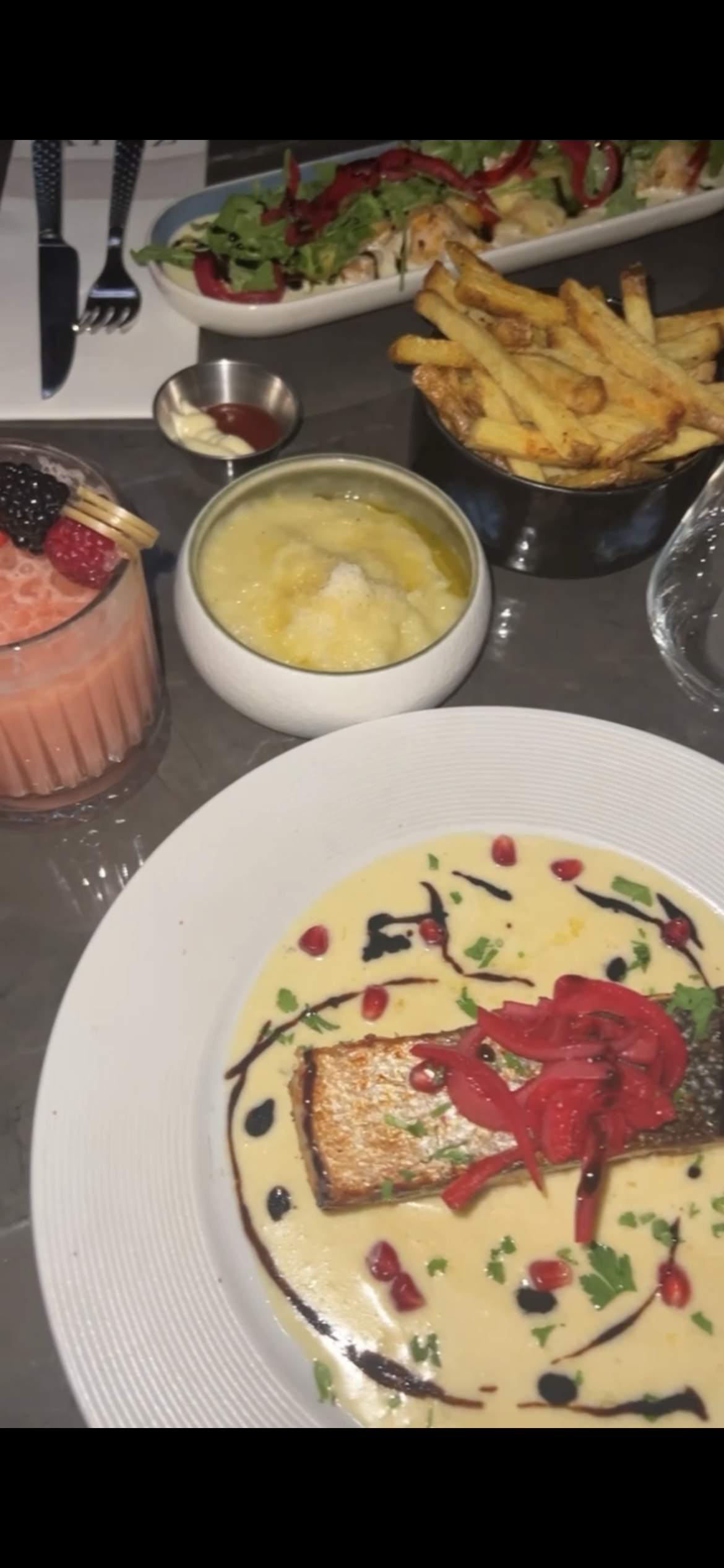 Beau restaurant, avec un personnel accueillant, les cocktails sont bons et la nourriture est bonne. Cependant gros point négatif au niveau du serveur qui s’est occupé de nous. Déjà je ne connais aucun autre restaurant à ce jour qui n’a pas de carafe d’eau ? A peine assises il viens nous demander notre commande, et cela était de même pour toutes les personnes autour de nous. C’était très oppressant et vraiment pas agréable, il rode autour des tables, pour nous débarrasser le plus vite possible et le comble : il nous apporte l’addition alors qu’on viens a peine de recevoir nos desserts. C’est vraiment dommage que le service soit aussi rapide en vue du prix on aurait aimer profiter davantage.