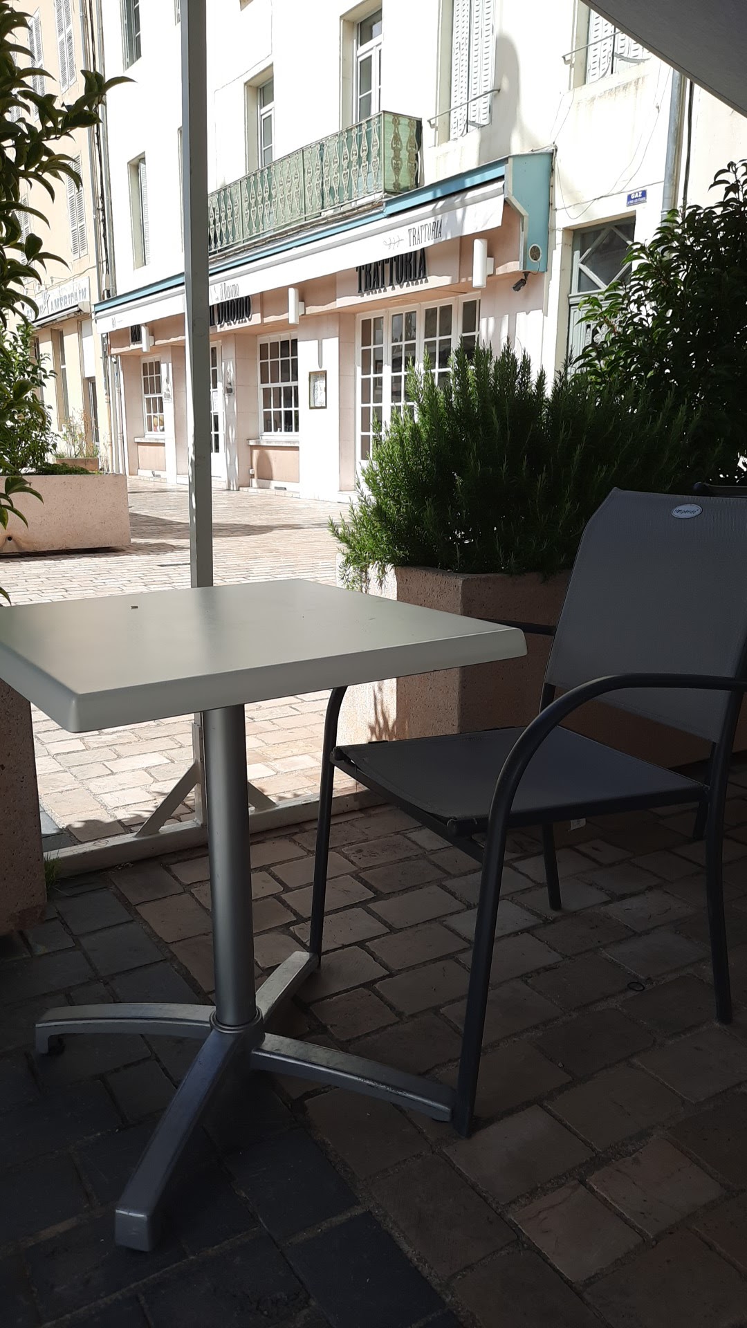 Arrivés vers les coups de 12h30, toutes les tables dehors étant déjà prises, ils nous ont proposé de nous en rajouter une plutôt que nous installer à l'intérieur (alors qu'il y avait de la place), plutot sympa ! La place est grande, pas de passage, pas de voiture, très calme en ce jeudi d'ascension. Pas beaucoup de choix à la carte, mais au moins ça ne sort pas du congélo. 2 viandes et un poisson. Simple mais très bon. Pour le dessert plus de choix et tout aussi bon. La carte des vins est bien remplie. Nous avons passé un excellent déjeuner ! Je recommande vivement !