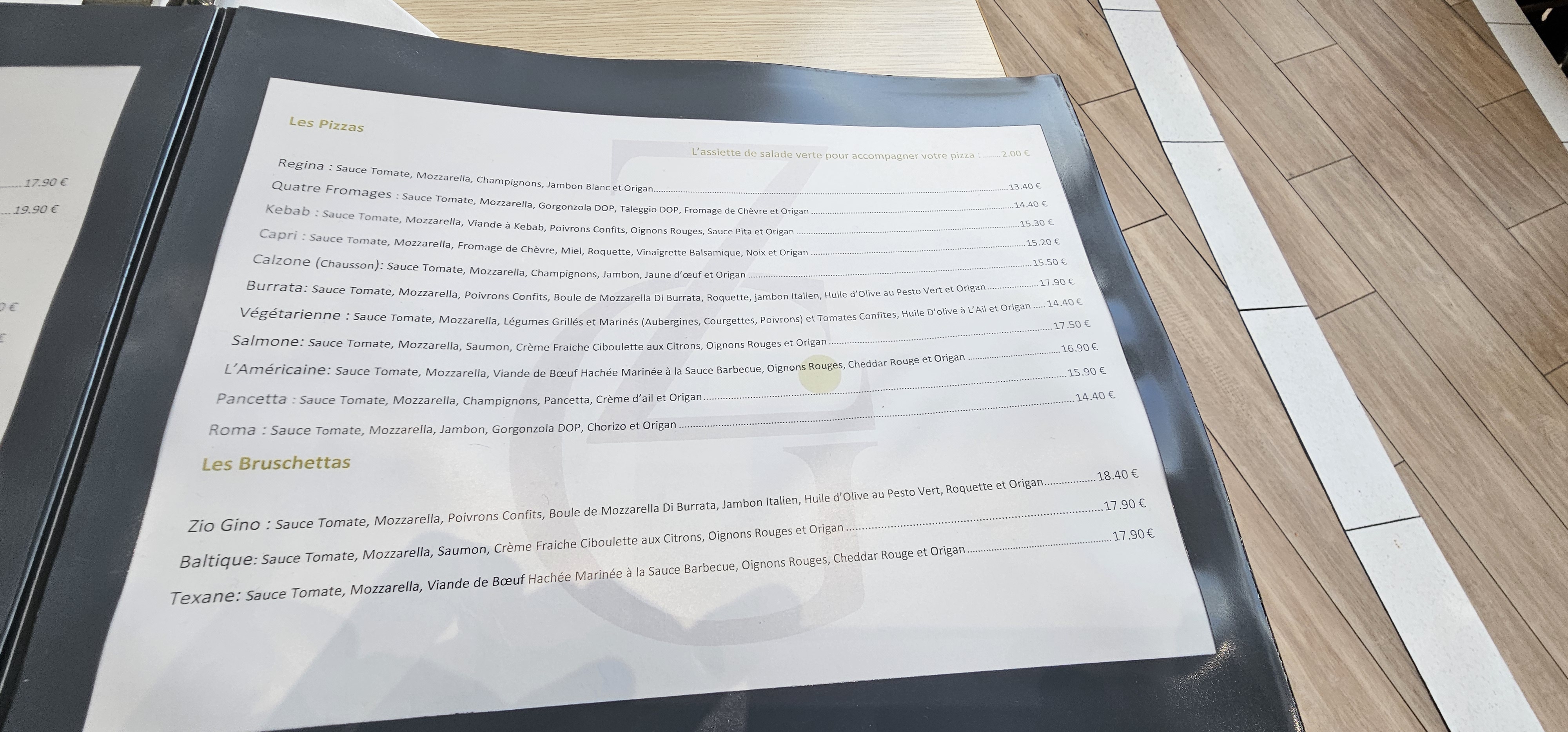Zio Gino est un restaurant italien qui fait pâtes pizza et autres le service est rapide mais le temps d’attente pour y entrer l’addition est servie avec des petits bonbons pour les enfants et les prix sont corrects (pizza entre 15€ et 20€, pâtes a 15€)