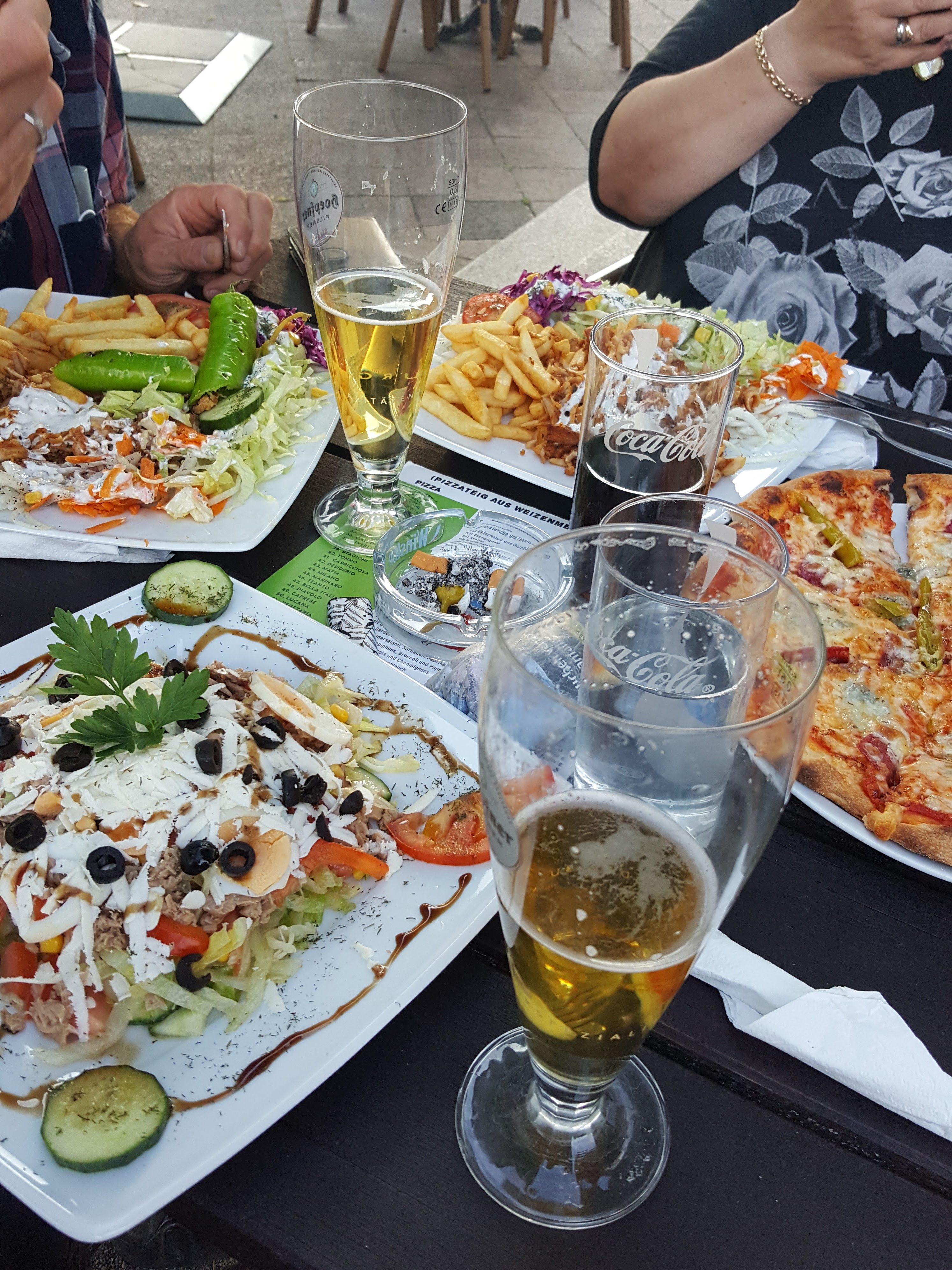 Je viens de rentrer avec ma femme et je ne retournerai plus dans ce restaurant. C'est choquant de voir à quel point le service est mauvais. Après notre commande (2 blés, pepperoni en entrée et 2 pizzas), la serveuse a traversé la frontière jusqu'au supermarché - ce n'est pas une blague - pour apparemment acheter les ingrédients manquants. Après environ 20 minutes (un peu plus longtemps), la bière est arrivée. Attention, dans le café en plein air et au restaurant, il n'y avait que 3 tables occupées pour un total d'environ 10 personnes. L'apéritif que nous avons commandé était accompagné de la pizza - enfin, pas la fin du monde. Mais il était hors de question de commander un deuxième blé, le militaire consacrait 100 % de son temps aux verres lavés, qu'il séchait avec dévouement. Après des signes intensifs, nous avons pu nous faire connaître et payer. Malheureusement, c'est dommage que je ne puisse pas donner une meilleure note à ce magnifique café en plein air.